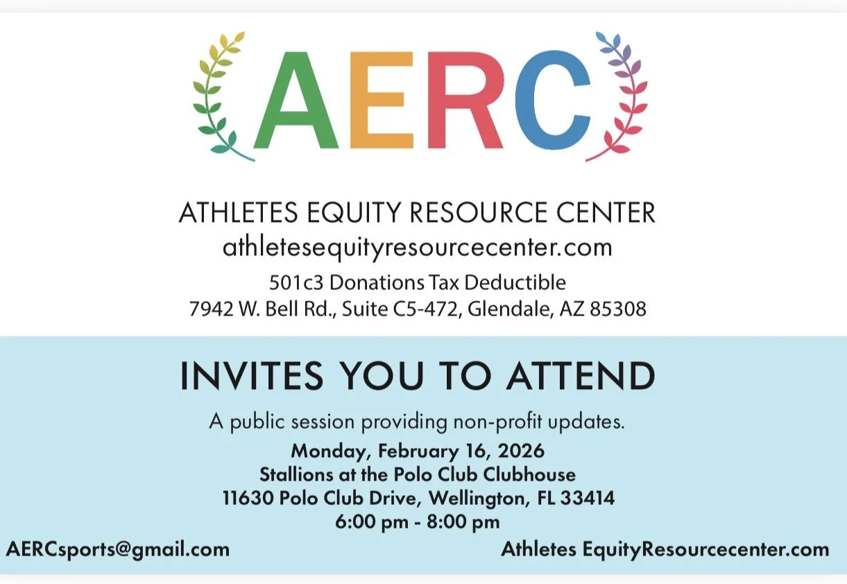 The Athletes Equity Resource Center (AERC) and Athletes for Equity in Sport (AES) public meeting is scheduled for February 16, 2026, in Wellington, FL, at the Polo Club restaurant Stallions.